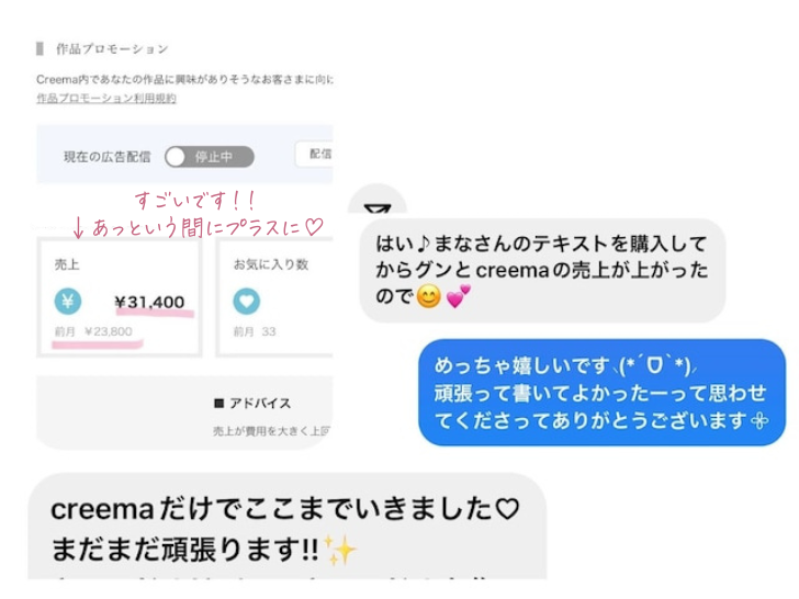 『まなさん…全然売れなくて困っていて思い切って購入させて頂いたら…2ヶ月目で教材費がプラスになりました…本当にありがとうございます』